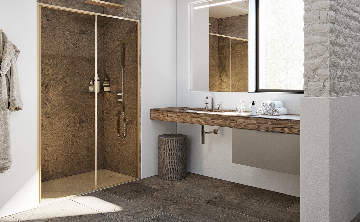È caratterizzata da un solo lato in vetro sul quale si trova la porta, mentre sui lati rimanenti è delineata da muri. Sfrutta una rientranza già esistente del bagno, anche di forma irregolare, o la crea in fase di ristrutturazione o costruzione, attraverso una o più pareti in cartongesso o muratura. Queste possono essere arricchite da piani di appoggio per i prodotti per la cura del corpo, realizzati secondo le specifiche esigenze dei proprietari, e inoltre permettono, sul lato esterno, di essere sfruttate per addossare pensili e sanitari.