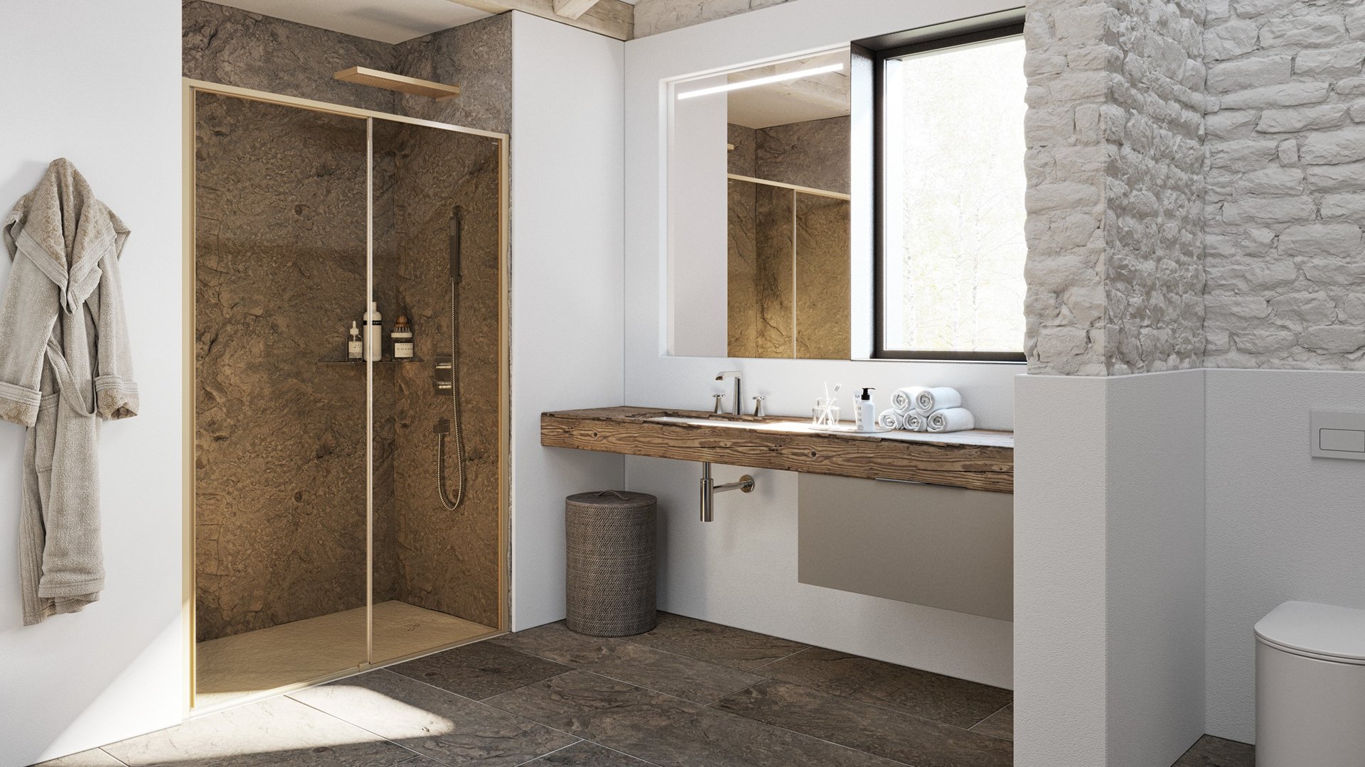 La douche en niche se caractérise par un seul côté en verre sur lequel se trouve la porte, tandis que sur les côtés restants elle est délimitée par des murs. Il exploite une cavité existante de la salle de bain, même de forme irrégulière, ou il la crée en cours de rénovation ou de construction, à travers une ou plusieurs cloisons en plâtre ou en maçonnerie. Celles-ci peuvent être enrichies par des plans de soutien pour les produits de soins du corps, réalisés selon les exigences spécifiques des propriétaires, et permettent également, sur le côté extérieur, d’être exploitées pour poser des meubles suspendus et sanitaires. Toutes les solutions sont certifiées TÜV SÜD.