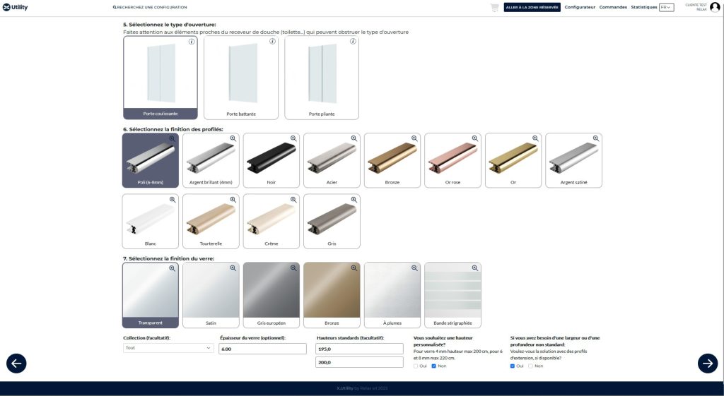 A la fin des choix il est possible d’indiquer une préférence de collection (facultatif), l’épaisseur du verre (facultatif), la hauteur standard souhaitée (facultatif). Dans le configurateur de cabine de douche en ligne, il est également possible d’indiquer une hauteur personnalisée pour des solutions personnalisées et d’utiliser le profil de compensation pour avoir un produit standard avec l’ajout du profil de compensation.