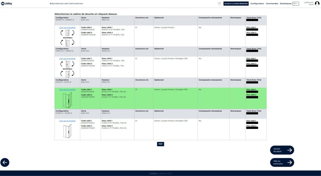 - Configurateur cabine de douche en ligne : écran récapitulatif