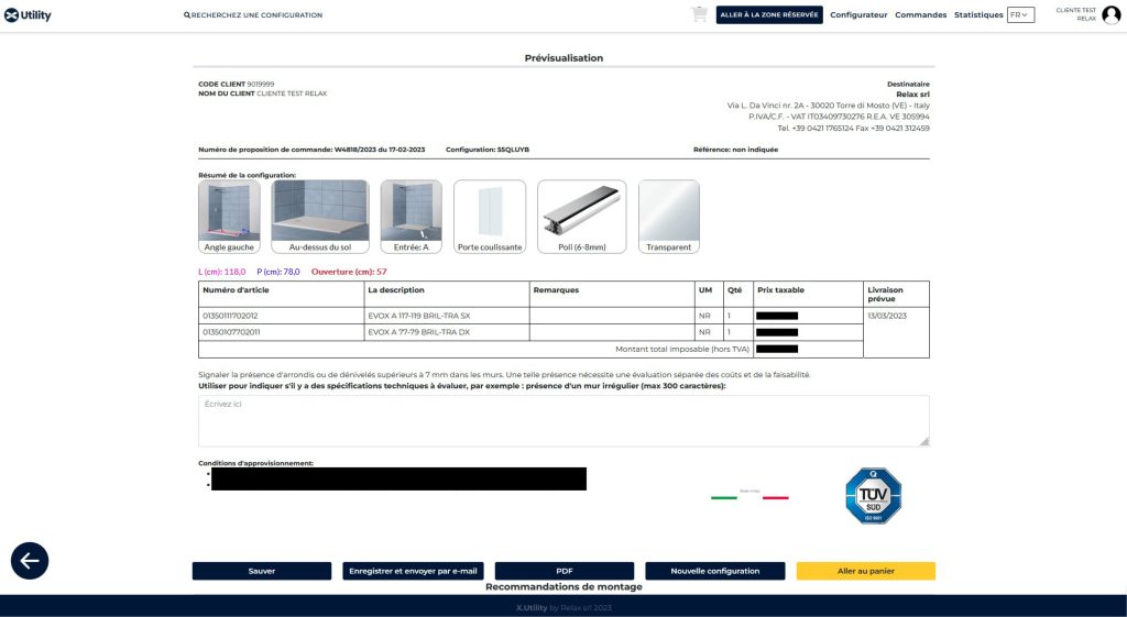 Vous êtes arrivé au dernier écran récapitulatif du configurateur de cabine de douche en ligne. Dans l’écran récapitulatif vous retrouverez toutes les informations utiles vues précédemment. Du choix de la configuration effectuée (y compris les finitions), aux codes des articles choisis et leur prix relatif, le tout sur un seul écran. Vous verrez facilement le numéro de la proposition de commande, le nom de la configuration (un code unique qui ne représentera toujours que votre configuration) et la référence saisie dans la phase initiale.