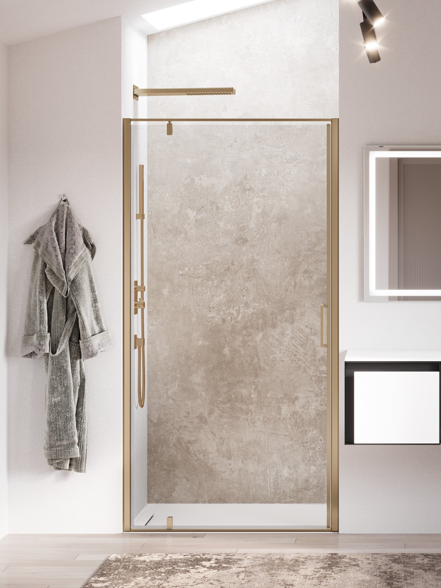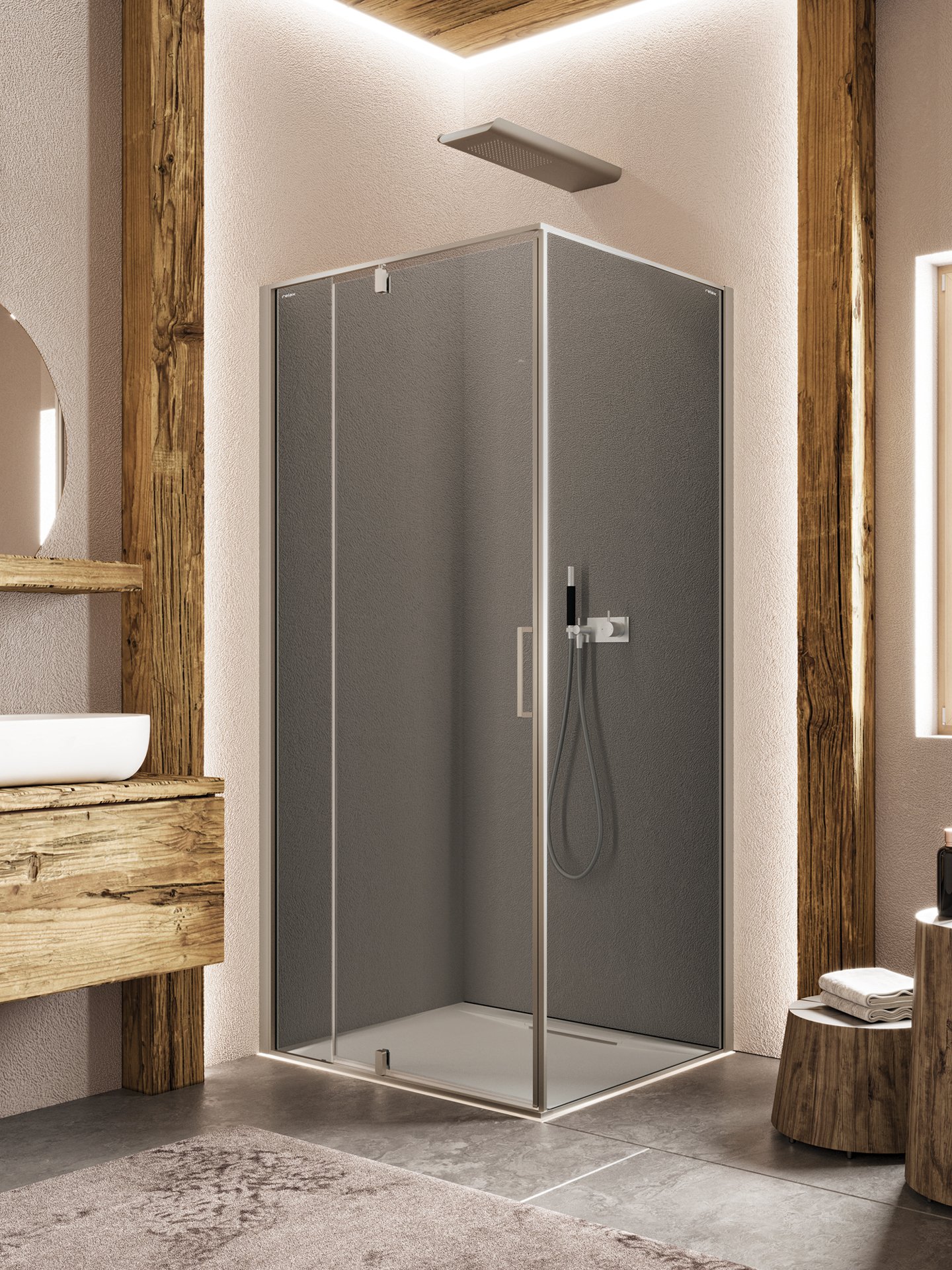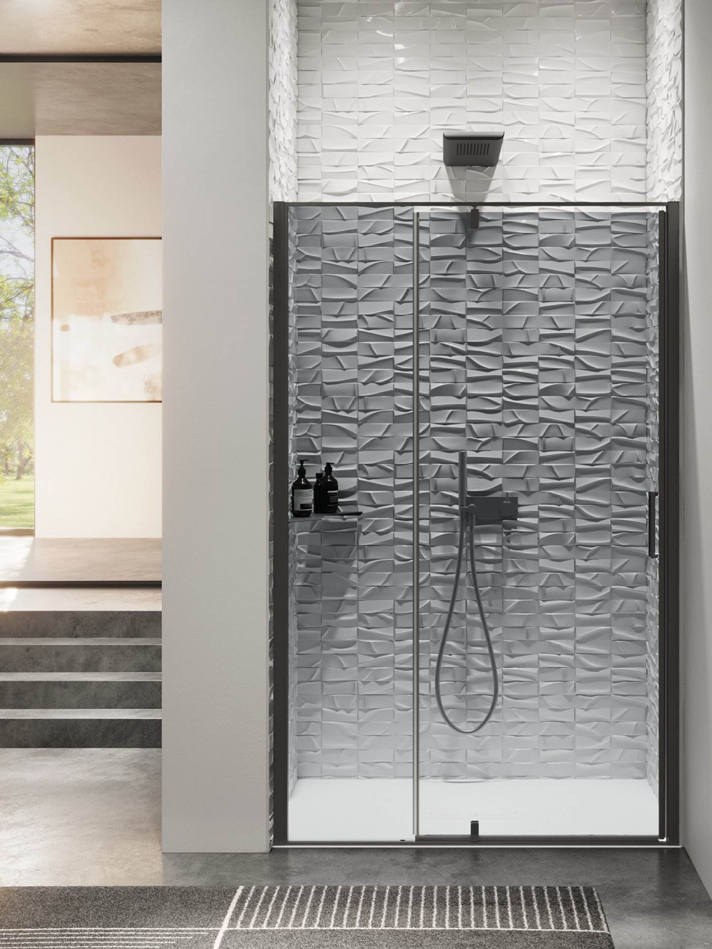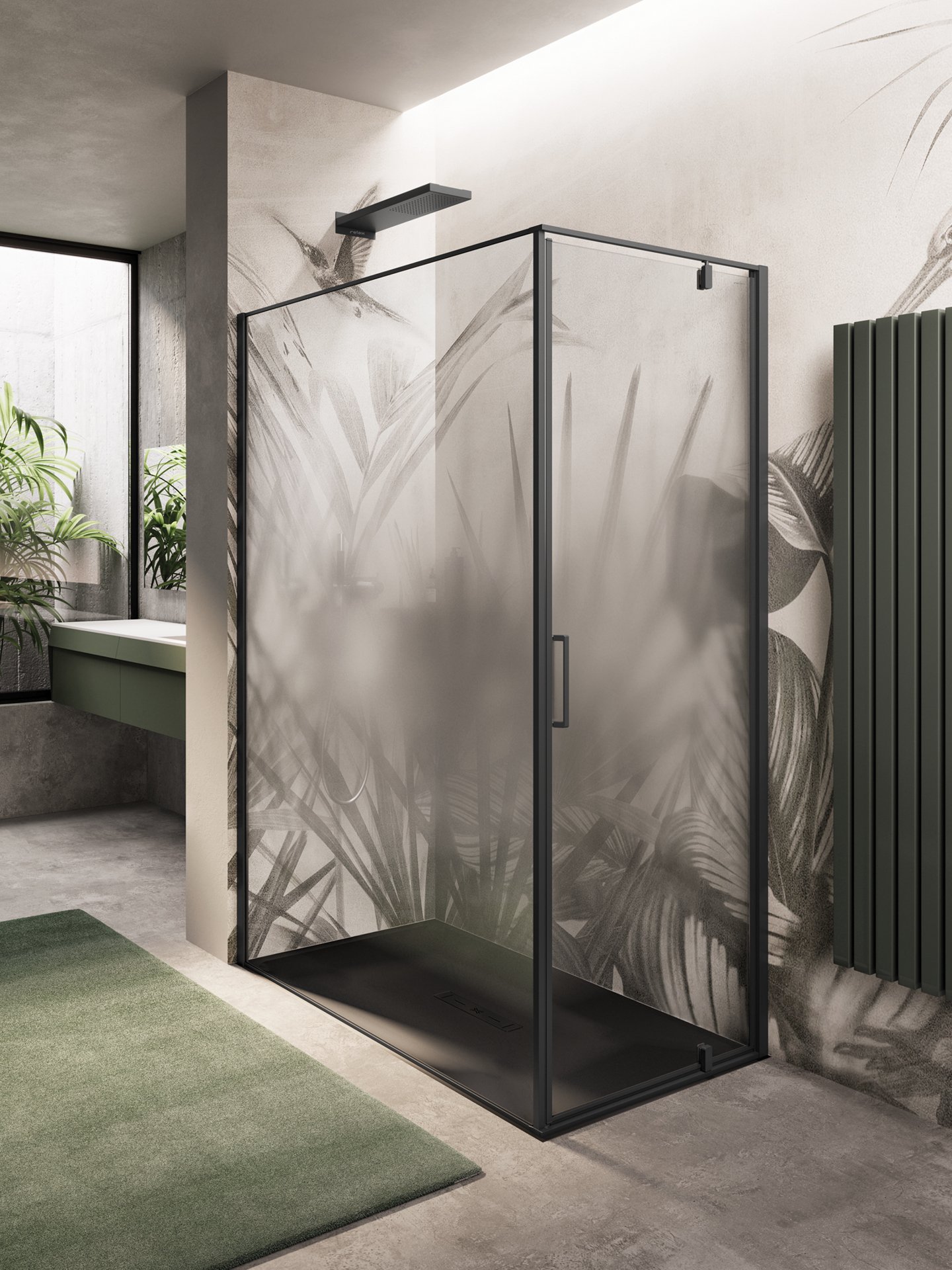 Cabine doccia dal design essenziale. Si distinguono per la purezza estetica della porta pivot, con apertura interna ed esterna, che consente di ridurre l’ingombro. L’apertura pivot dell’anta (con punto di rotazione a 18 cm dal muro) permette il pieno utilizzo della parete adiacente alla porta.
