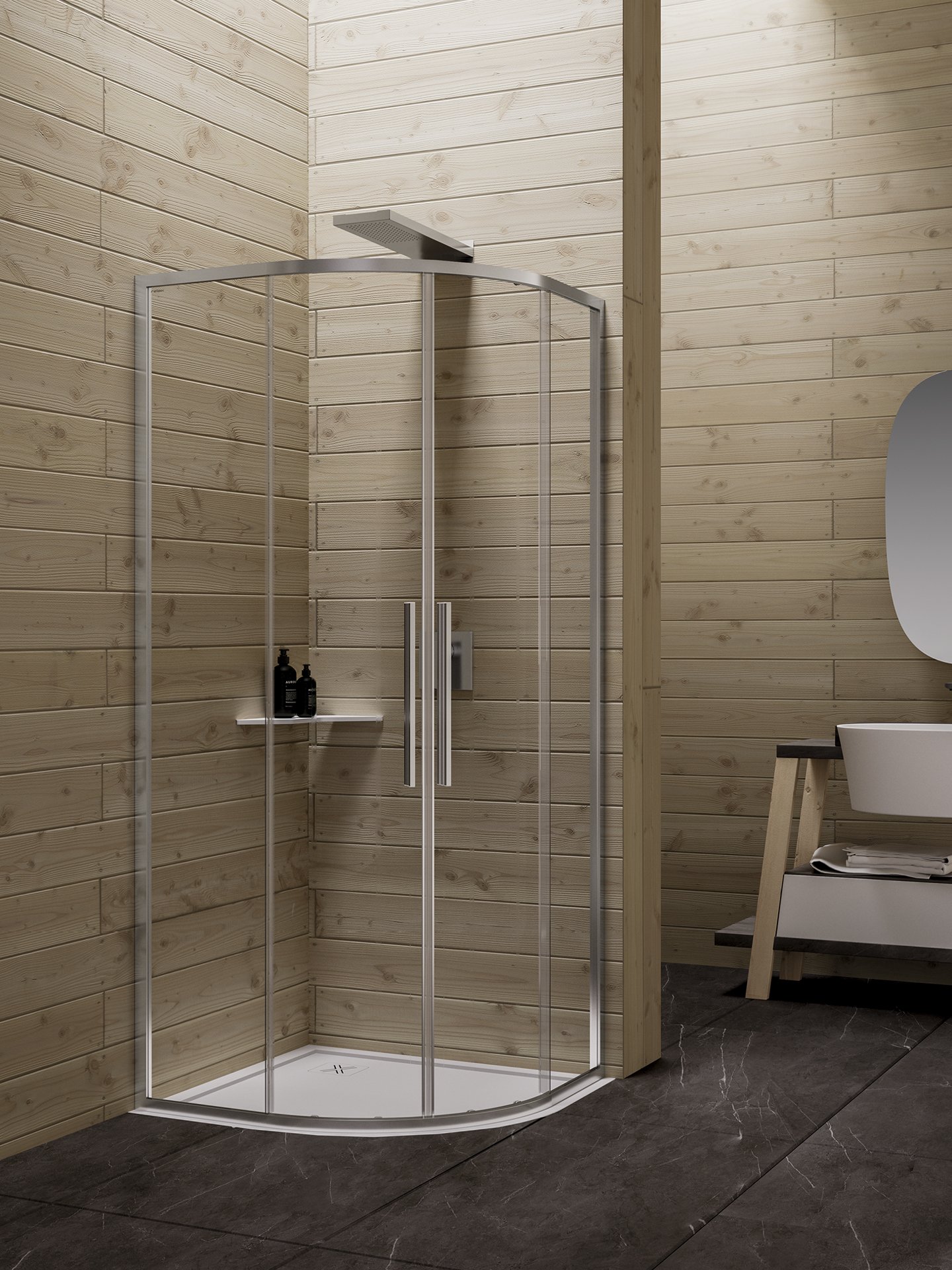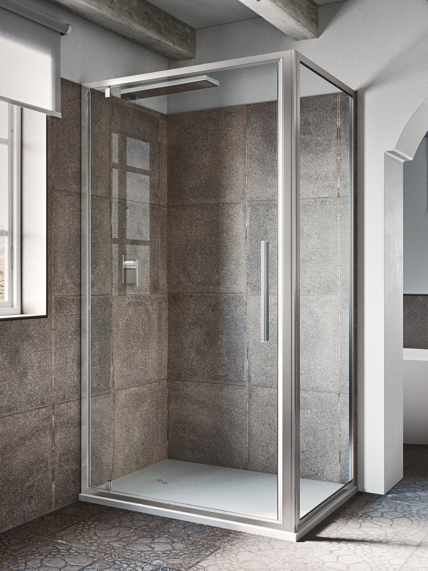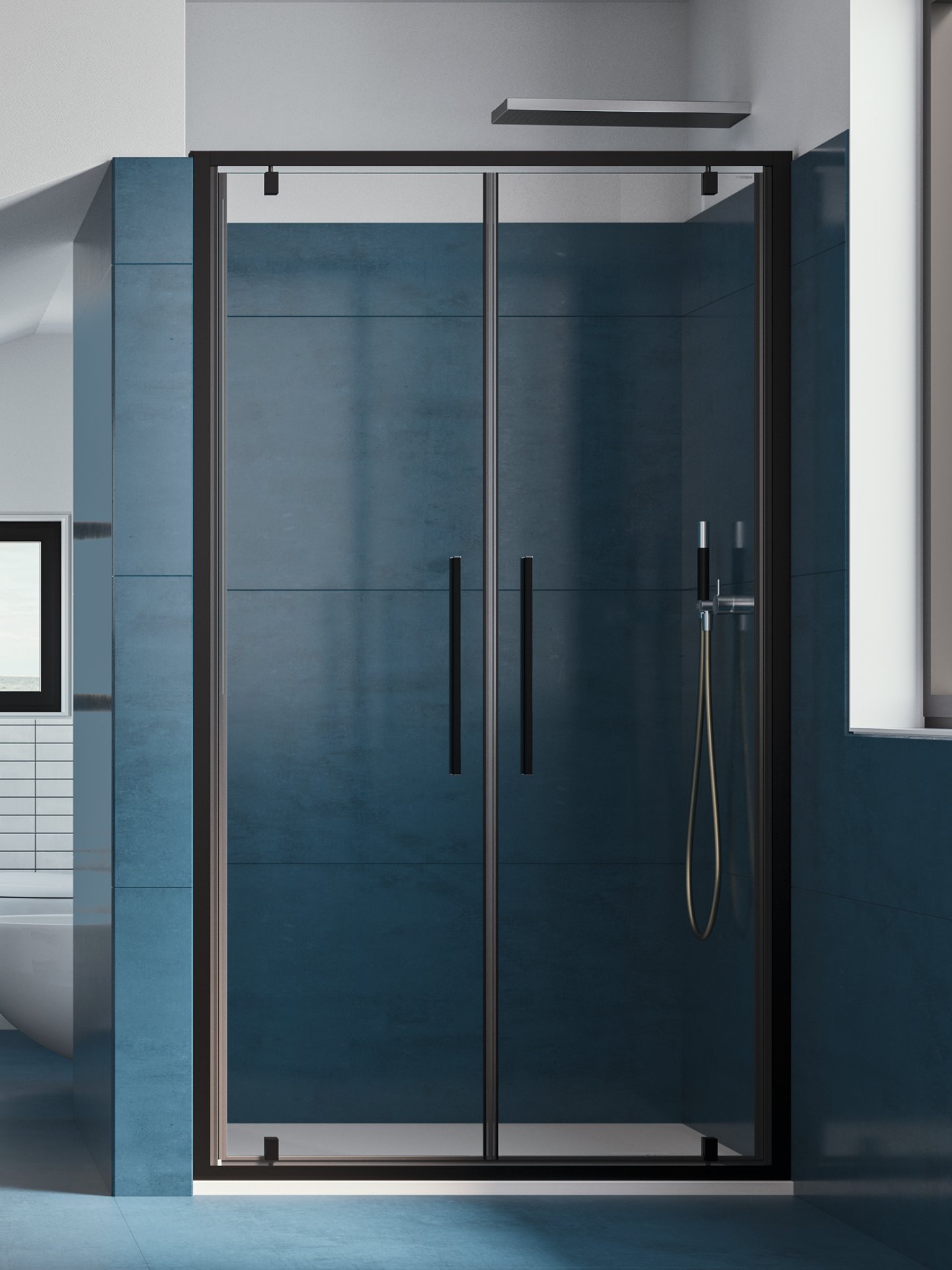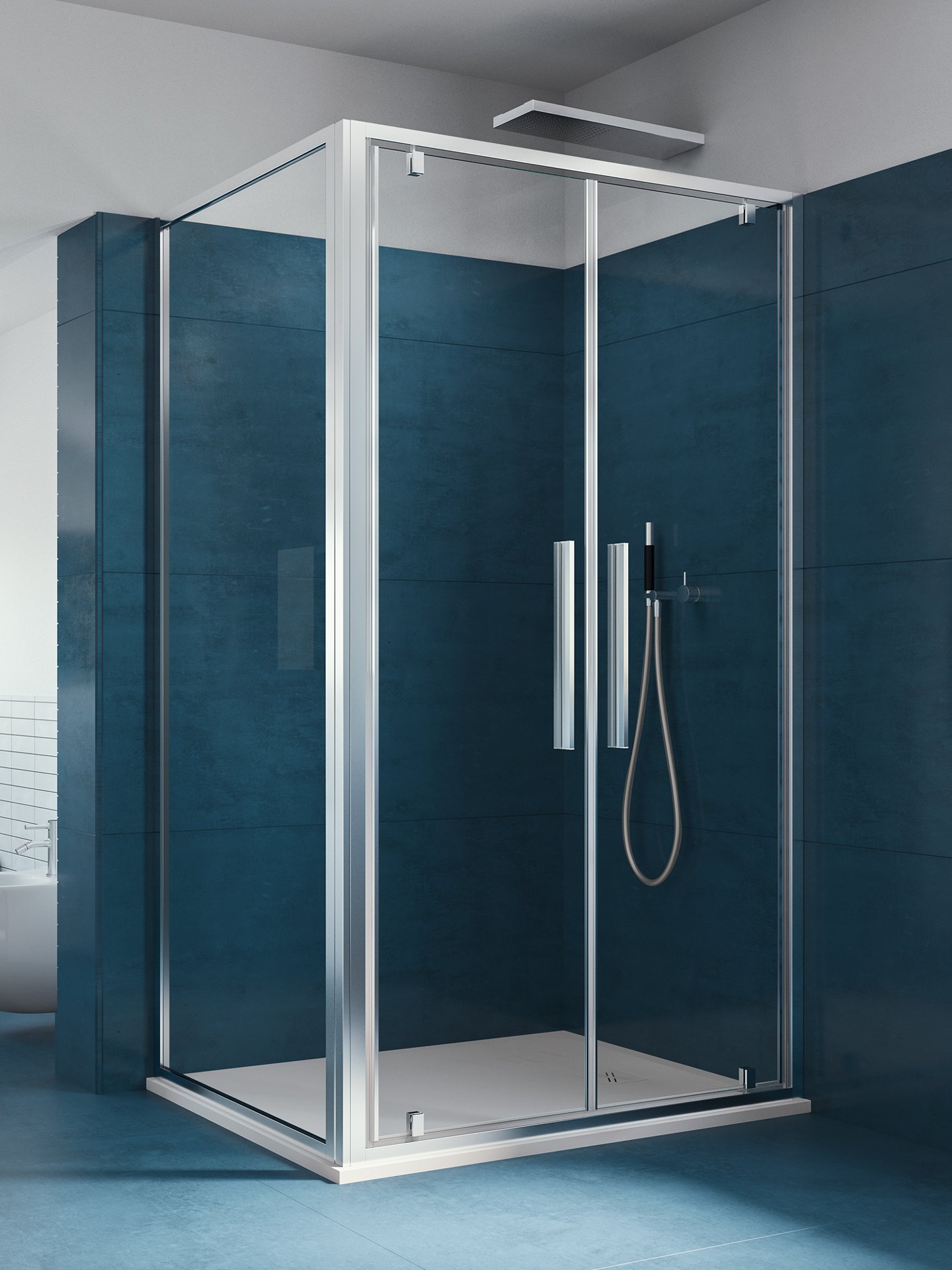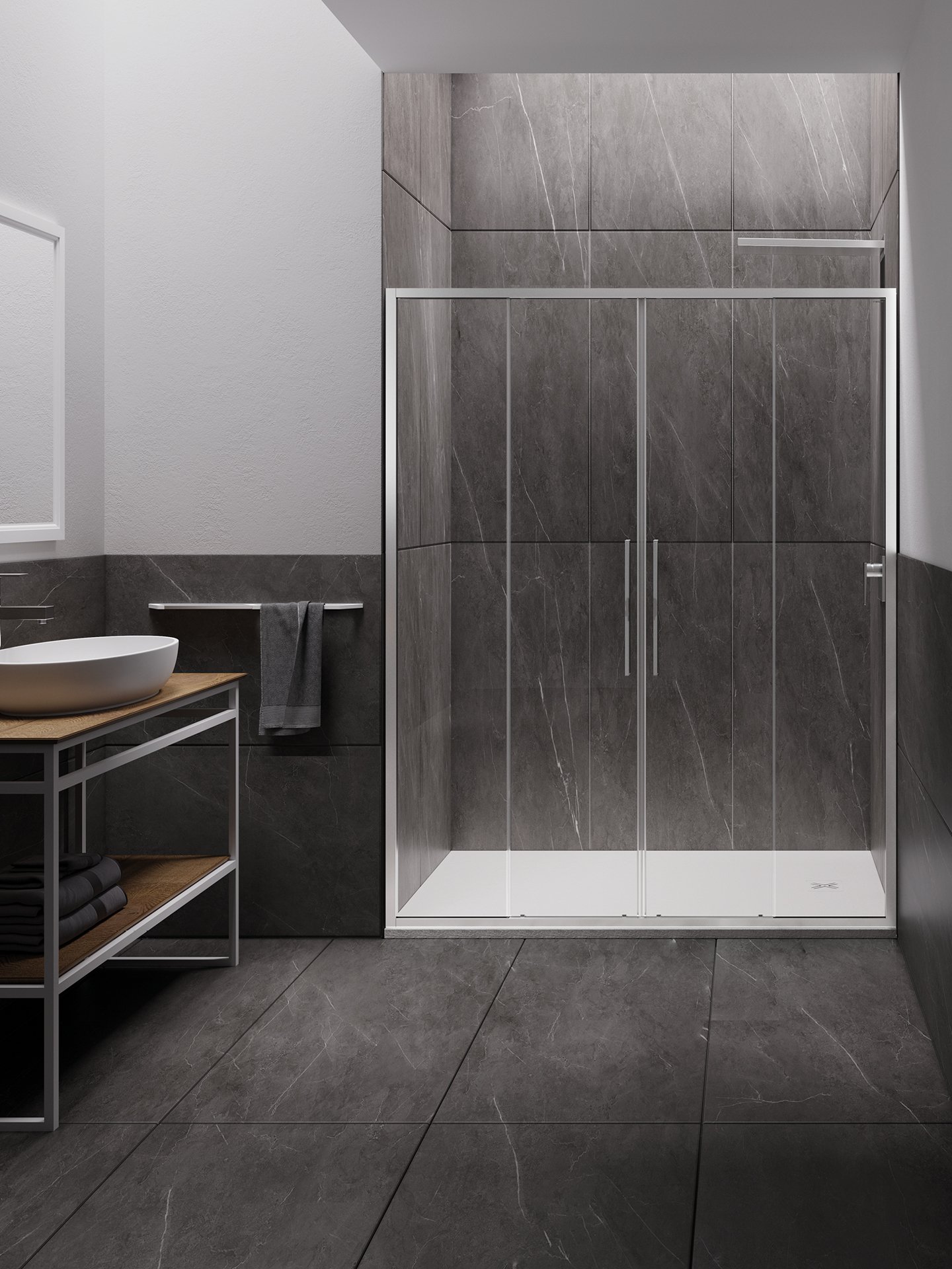 Cabine doccia ad ante scorrevoli con un profilo estremamente sottile (3 cm) e cornice a contrasto in dotazione. Nel caso dell’apertura scorrevole, i cuscinetti sono completamente nascosti dal carter in alluminio. Disponibili anche la versione con apertura a battente.