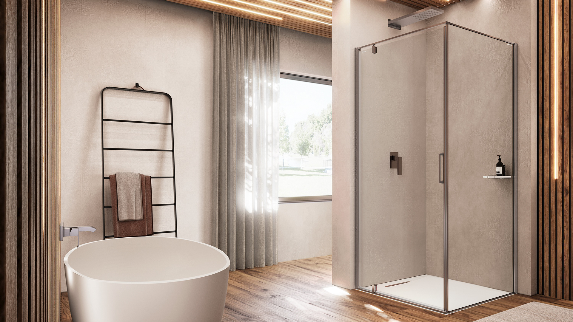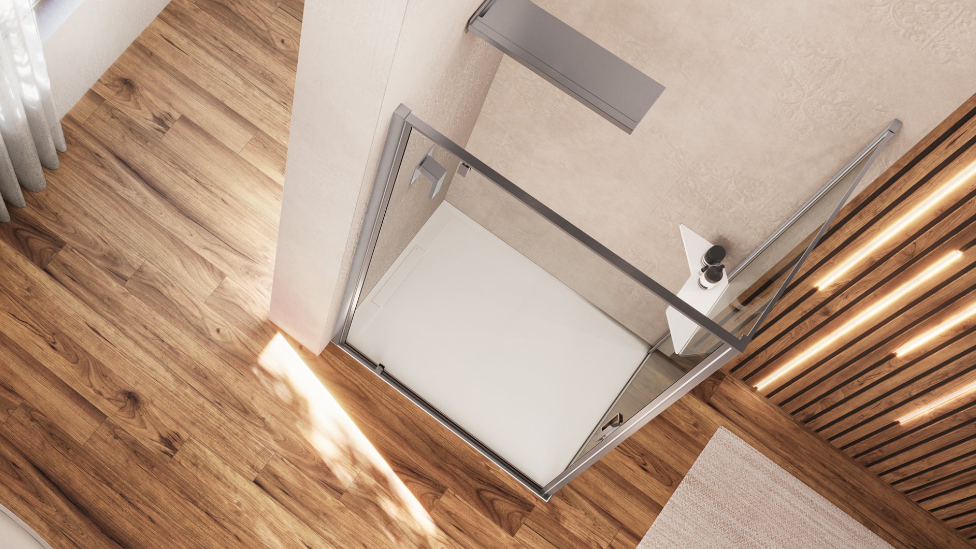 La collezione Kubik si distingue per la caratteristica apertura a pivot che esalta gli spazi circostanti, permettendo l’installazione di elementi di arredo anche in prossimità dell’ingresso della cabina.