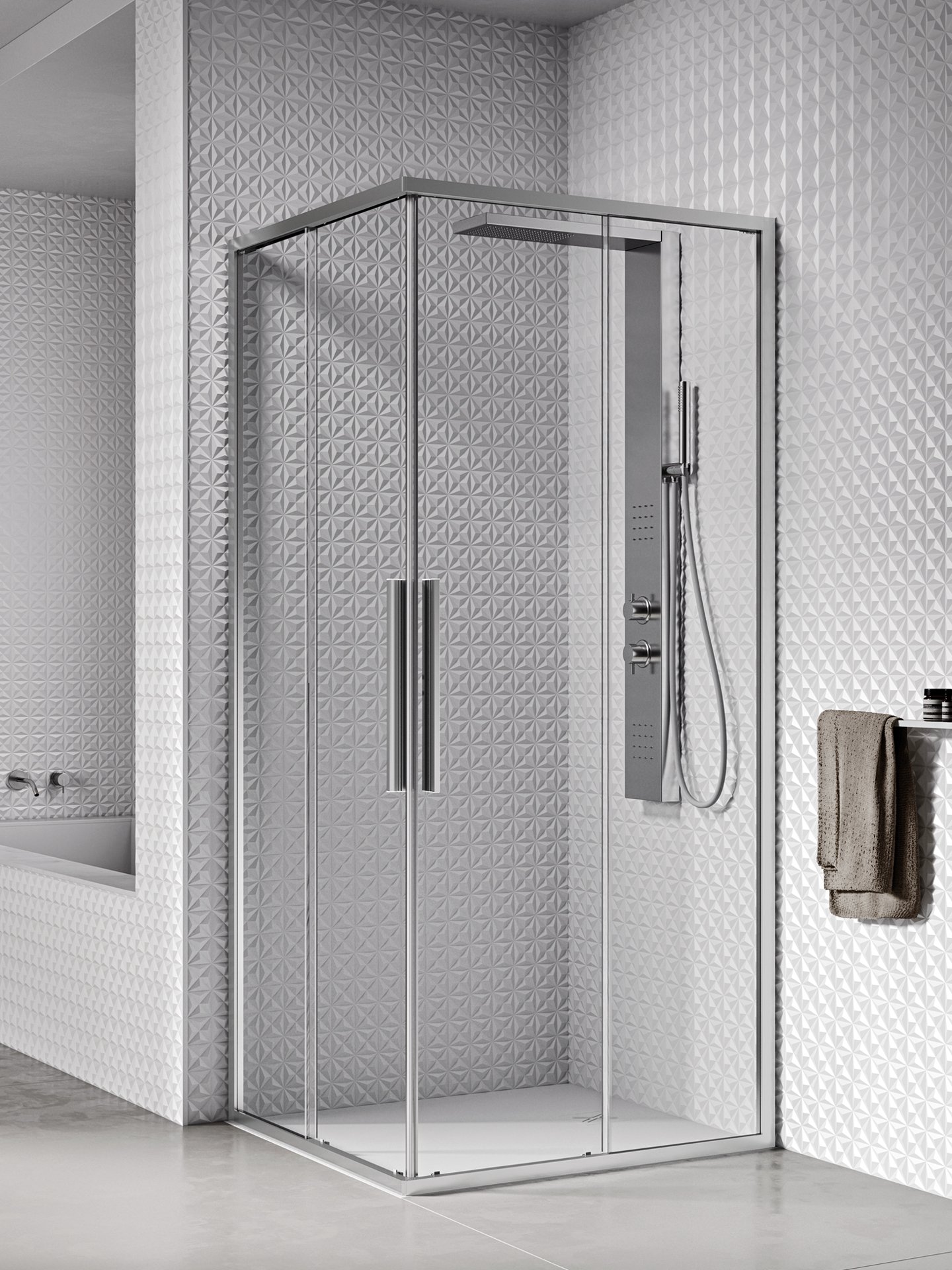 Unico A+A è un box doccia ad angolo con doppia anta scorrevole. A richiesta, è disponibile anche con tetto e colonna con idrogetti.