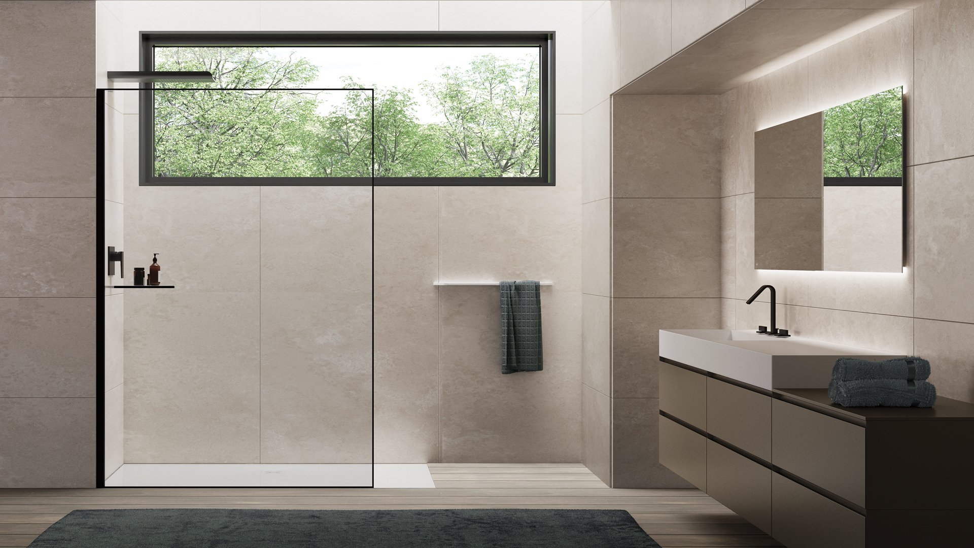 La versione Wall A è una cabina doccia walk-in con spessore del vetro di 6 o 8 mm, dal design essenziale.